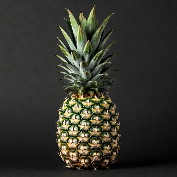 black background, fresh pineapple, fruit photography, fruit texture, green leaves, isolated pineapple, pineapple fruit, ripe pineapple, spiky crown, tropical fruit, yellow fruit, pineapple