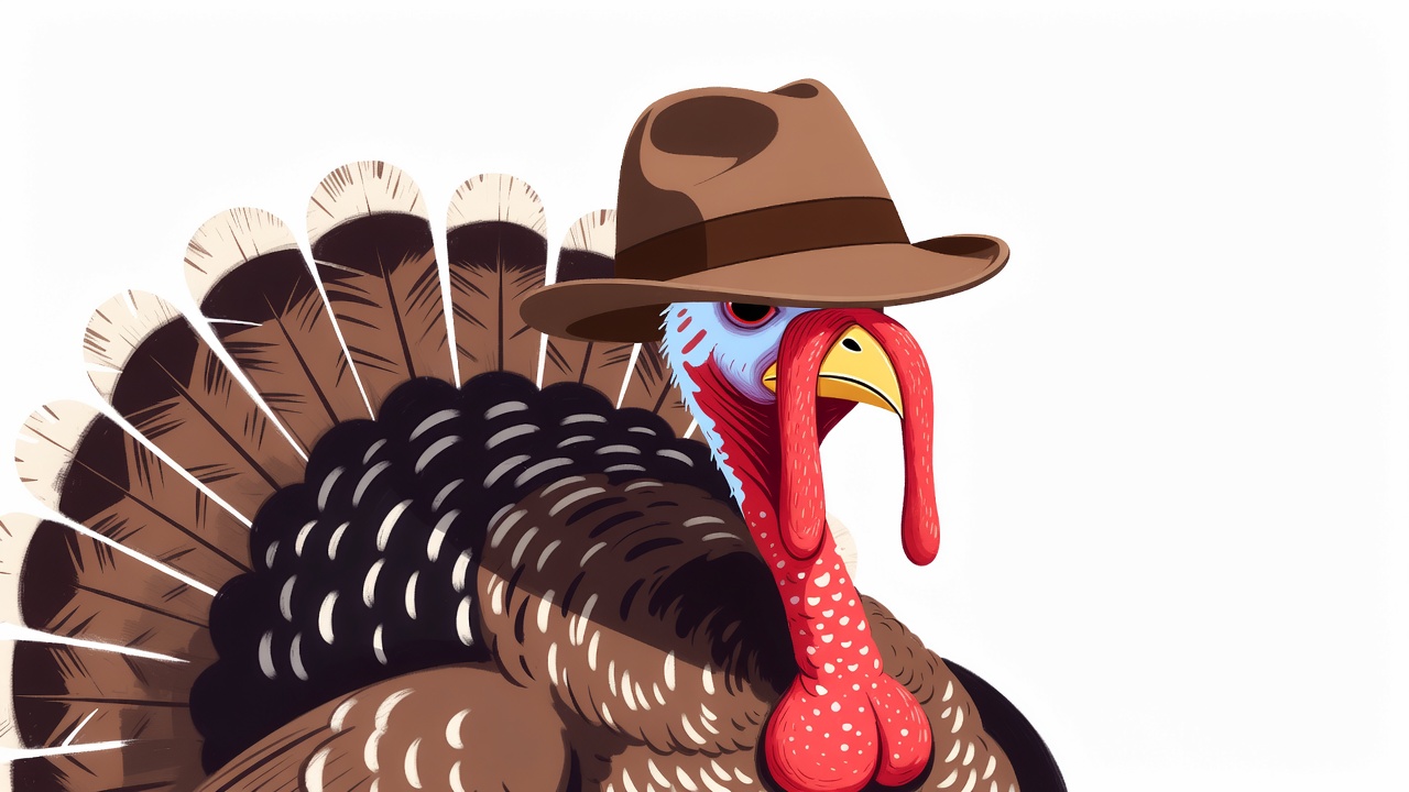 A colorful cartoon turkey stands with its large brown tail feathers fanned out. It wears a brown cowboy hat tilted on its head and has a red dangling wattle and blue face. The illustration is isolated on a white background.
