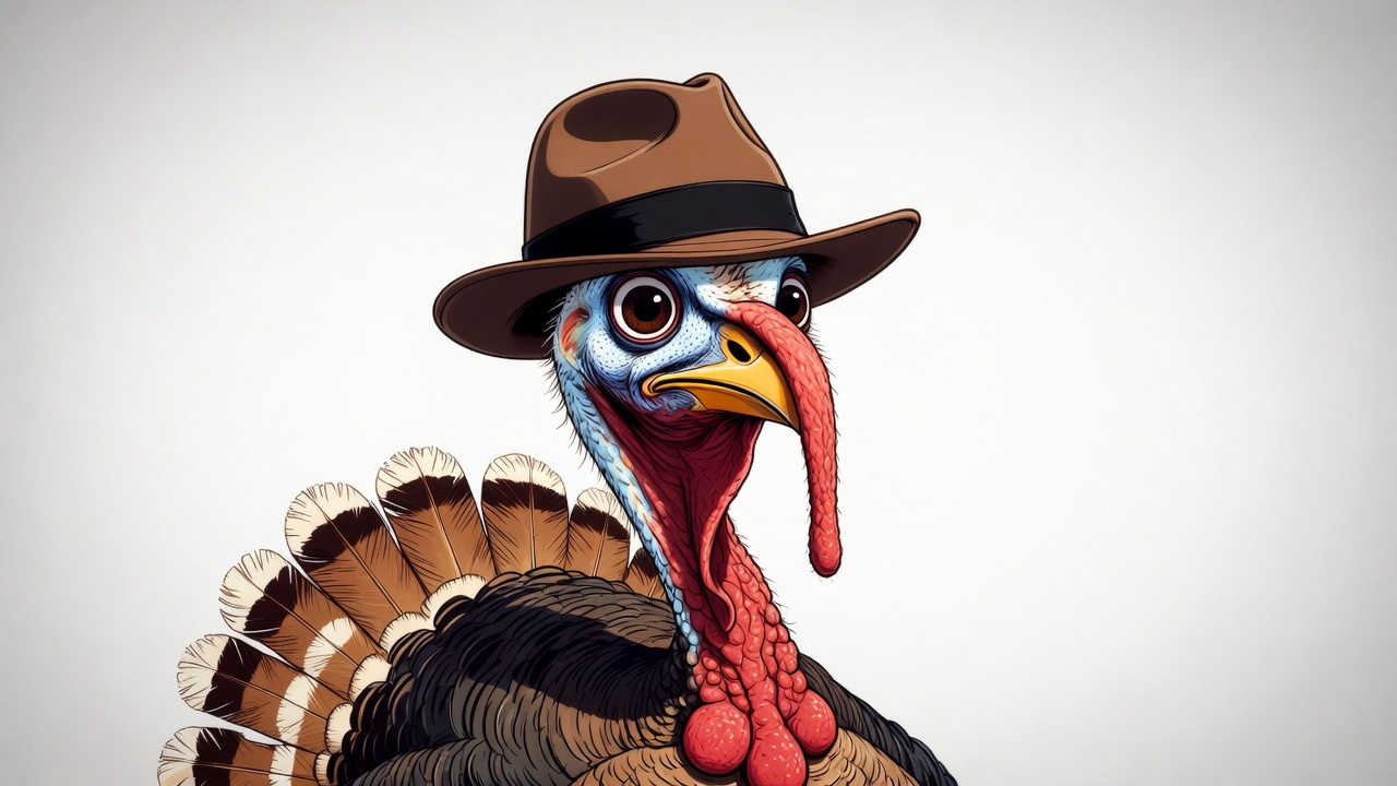 A cartoon turkey with wide eyes and a red wattle wears a brown fedora hat. Its feathers fan out behind its head against a white background. The illustration features bold lines and vibrant colors.