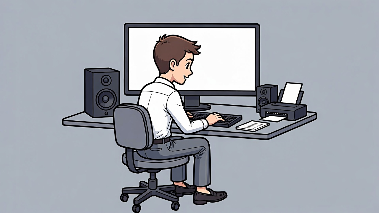 A cartoon man with short brown hair sits at a gray desk, typing on a keyboard in front of a large computer monitor. He wears a white dress shirt, gray pants, and black shoes, with speakers and a printer beside the setup. The scene features a simple gray background.