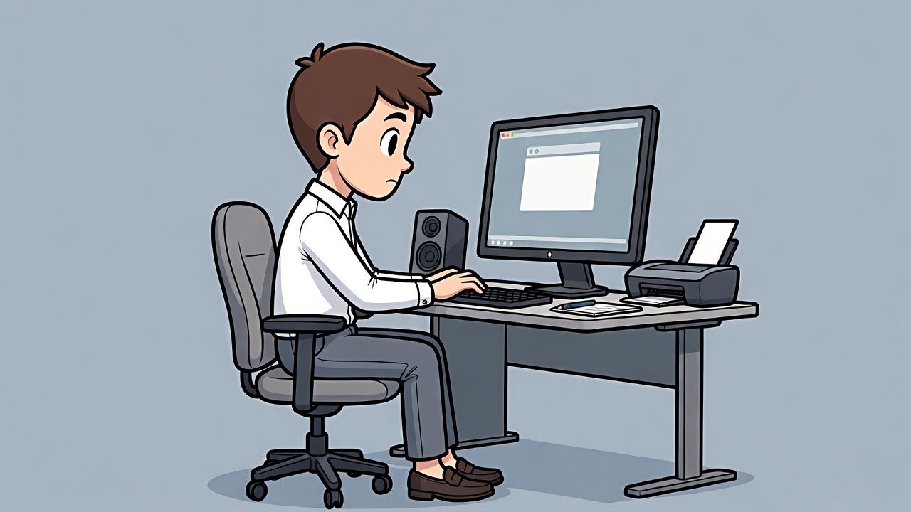 A young man with short brown hair sits at a desk, typing on a keyboard in front of a large computer monitor displaying a blank page. He wears a white dress shirt, gray pants, and brown shoes, with office equipment including speakers, a printer, and papers nearby. The scene is rendered in a colorful cartoon illustration style on a light blue background.