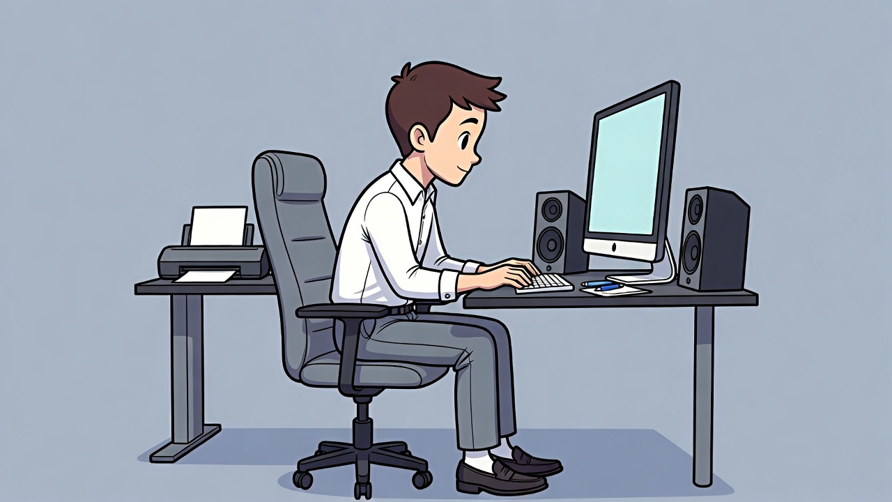 A young man in a white shirt and gray pants sits at a desk typing on a keyboard in front of a large monitor. He is seated in a gray office chair with a printer and speakers on the wooden desk. The scene is depicted in a colorful cartoon style on a light blue isolated background.