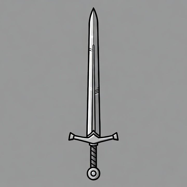 A detailed line art illustration of a medieval longsword with a straight double-edged blade and crossguard. The hilt features a twisted grip and a round pommel. It is centered on a solid gray background.