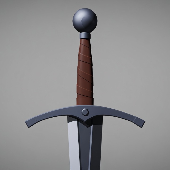 A 3D rendered medieval sword features a straight double-edged blade and a cruciform hilt. The grip is wrapped in brown leather, topped with a spherical pommel. It is centered against a plain gray background.