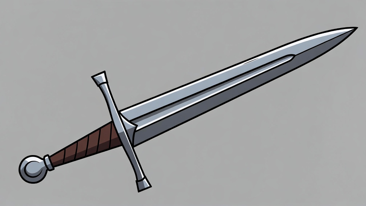 A detailed cartoon illustration of a medieval longsword with a straight silver blade and brown leather-wrapped hilt. The sword features a prominent crossguard and rounded pommel. It is depicted against a plain gray background.