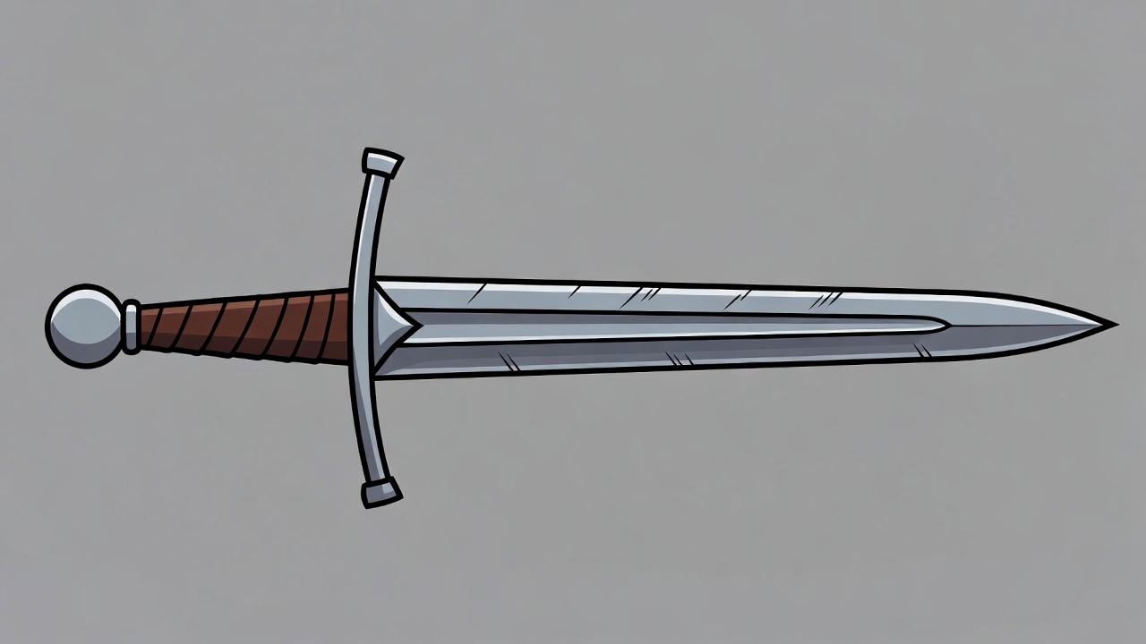 A detailed cartoon illustration of a medieval sword with a straight silver blade and pointed tip. It features a brown leather-wrapped hilt, silver crossguard, and round pommels at both ends. The sword is centered on a solid gray background.