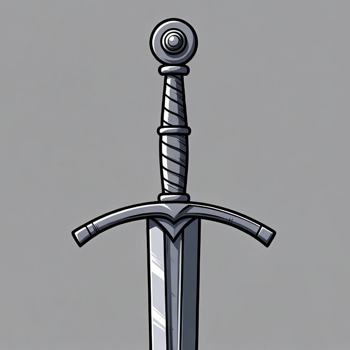 A detailed cartoon illustration of a medieval sword with a straight double-edged blade. It features a cruciform hilt with quillons, a twisted grip, and a round pommel. The sword is centered on a solid gray background.
