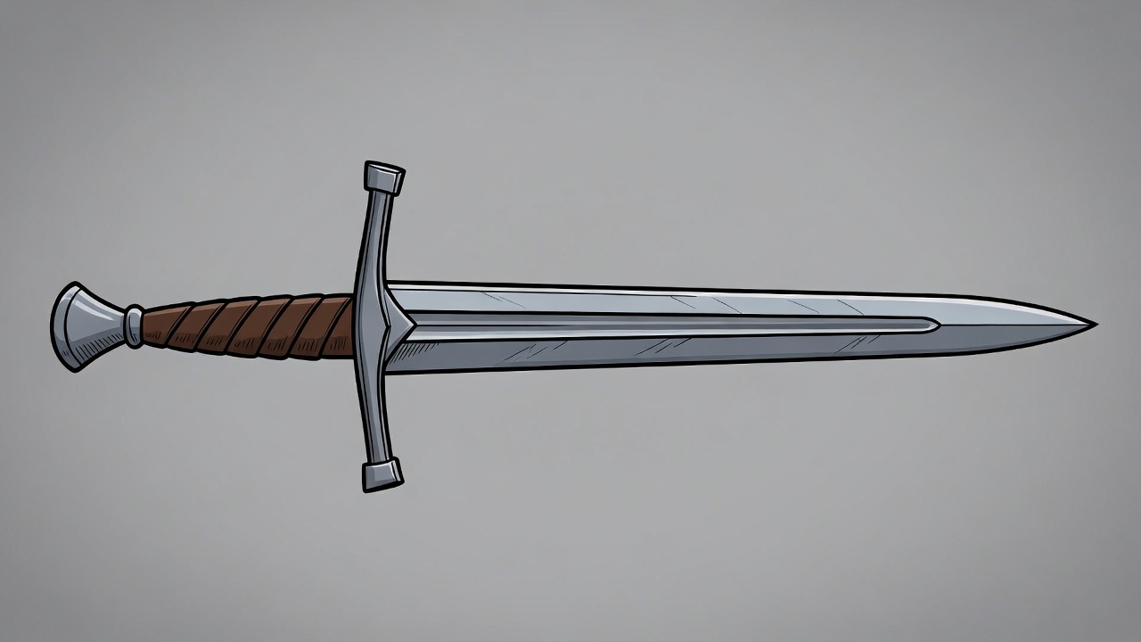 A detailed cartoon illustration of a medieval longsword with a silver blade and brown leather-wrapped hilt. The sword features a cruciform guard and is depicted on a transparent gray background. The sharp pointed tip and intricate line art emphasize its fantasy weapon design.