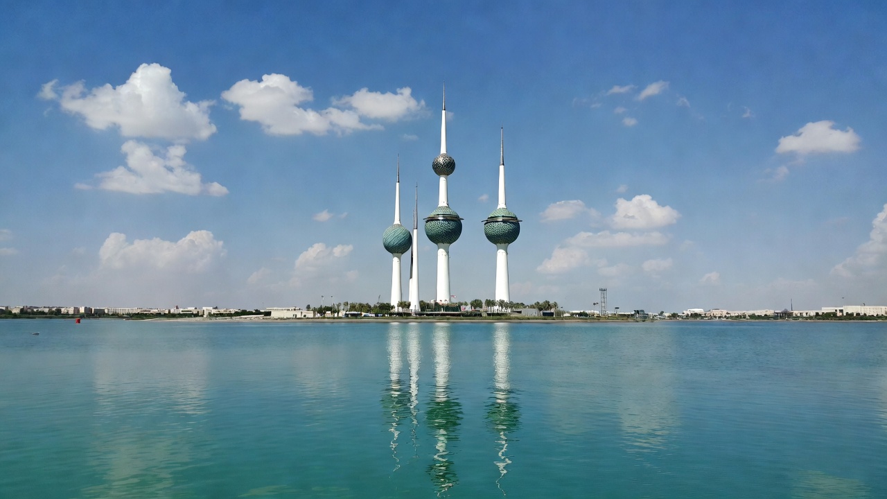 Kuwait City, Middle East, Persian Gulf, architecture, blue sky, clouds, green orbs, iconic towers, lake, landmark, landmark building, reflection, spires, sunny day, towers, travel, turquoise water, water, waterfront, Kuwait Towers