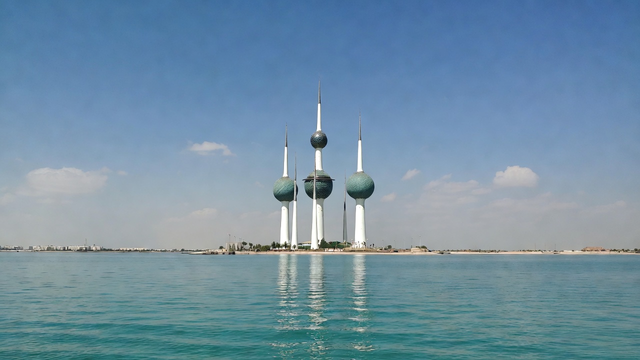 Kuwait City, Middle East, architecture, blue sky, clouds, gulf, iconic, island, landmark, modern, ocean, persian gulf, reflection, sea, skyline, spheres, spires, sunny day, tourist attraction, towers, travel, turquoise water, water, waterfront, Kuwait Towers