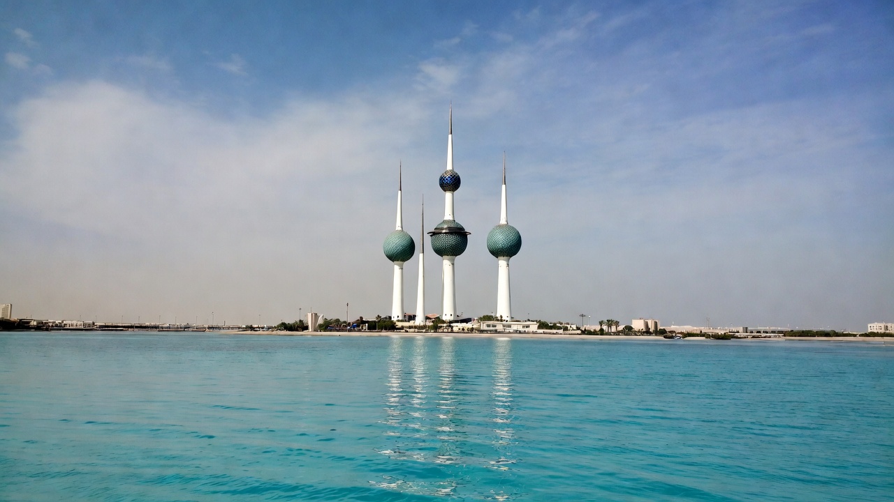 Kuwait City, Middle East, Persian Gulf, blue sky, clouds, green spheres, iconic towers, landmark, landmark building, modern architecture, peninsula, reflection, spires, sunny day, towers, travel, turquoise sea, water, waterfront, Kuwait Towers