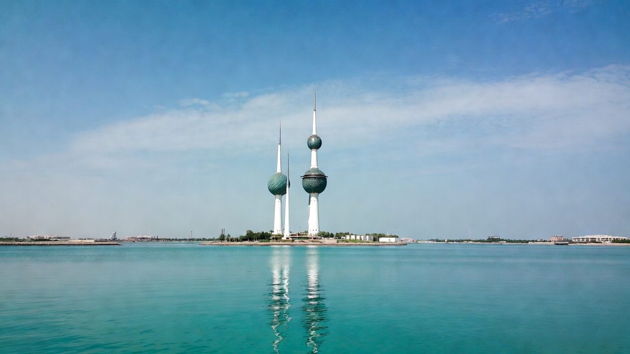 The iconic Kuwait Towers stand tall on an island in the sea, featuring two white towers topped with green spheres. Their reflections shimmer in the calm turquoise water under a clear blue sky. Surrounding structures and distant buildings are visible along the waterfront.