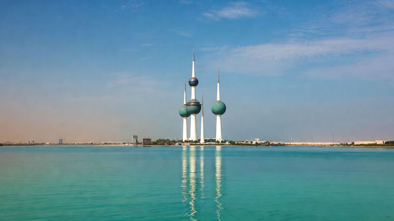 Three iconic Kuwait Towers with green spherical orbs stand tall on a small island in the turquoise waters of the Persian Gulf. Their reflections shimmer in the calm sea under a clear blue sky. Desert landscape and distant structures are visible in the background.