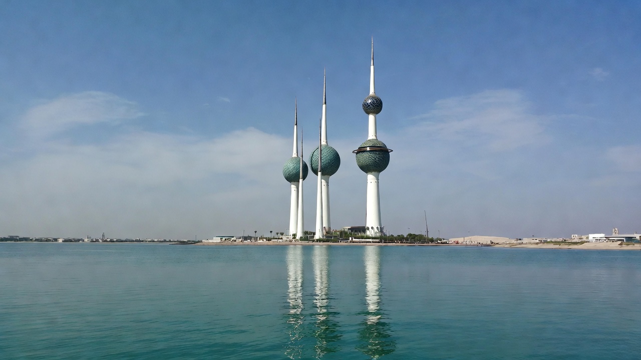 Kuwait City, Middle East, Persian Gulf, architecture, blue sky, clouds, coastal, daytime, green spheres, iconic, landmark, modern towers, reflection, sea, skyline, tourism, towers, travel, water, waterfront, Kuwait Towers