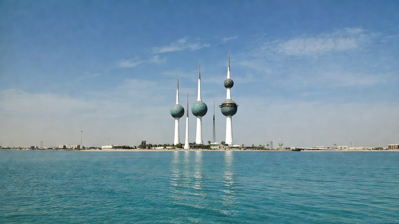 Kuwait City, Middle East, Persian Gulf, architecture, blue spheres, blue water, clouds, coastline, gulf view, landmark, landmark, modern towers, reflection, sky, sunny day, towers, travel, water, Kuwait Towers