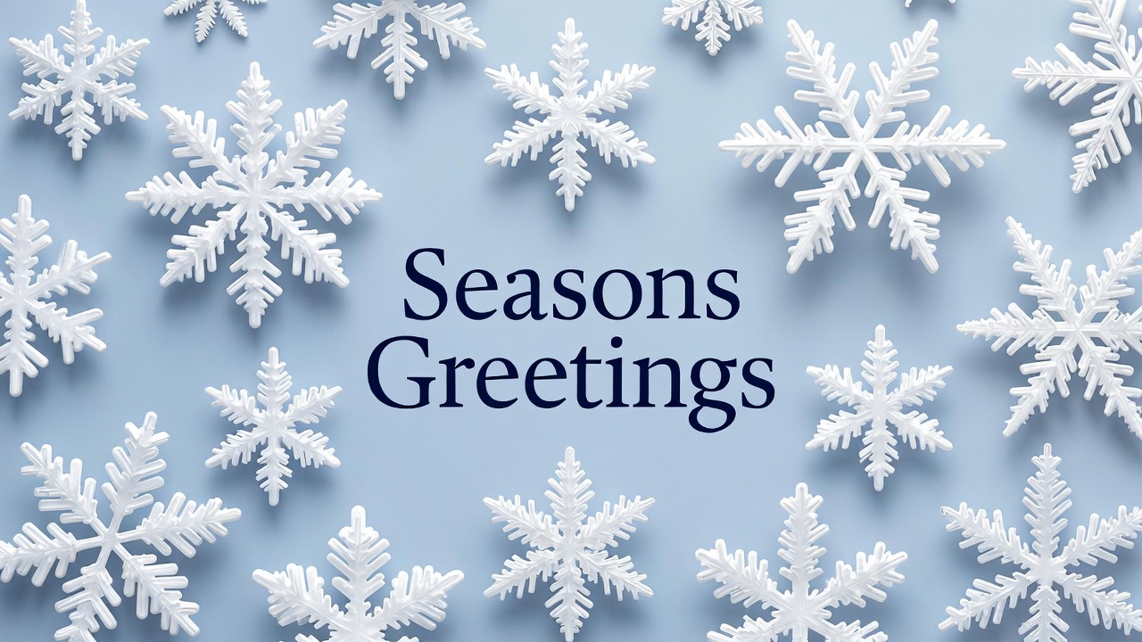 A festive background features numerous white snowflakes scattered on a light blue surface. The text 'Seasons Greetings' is prominently displayed in elegant navy blue font amidst the snowflakes.