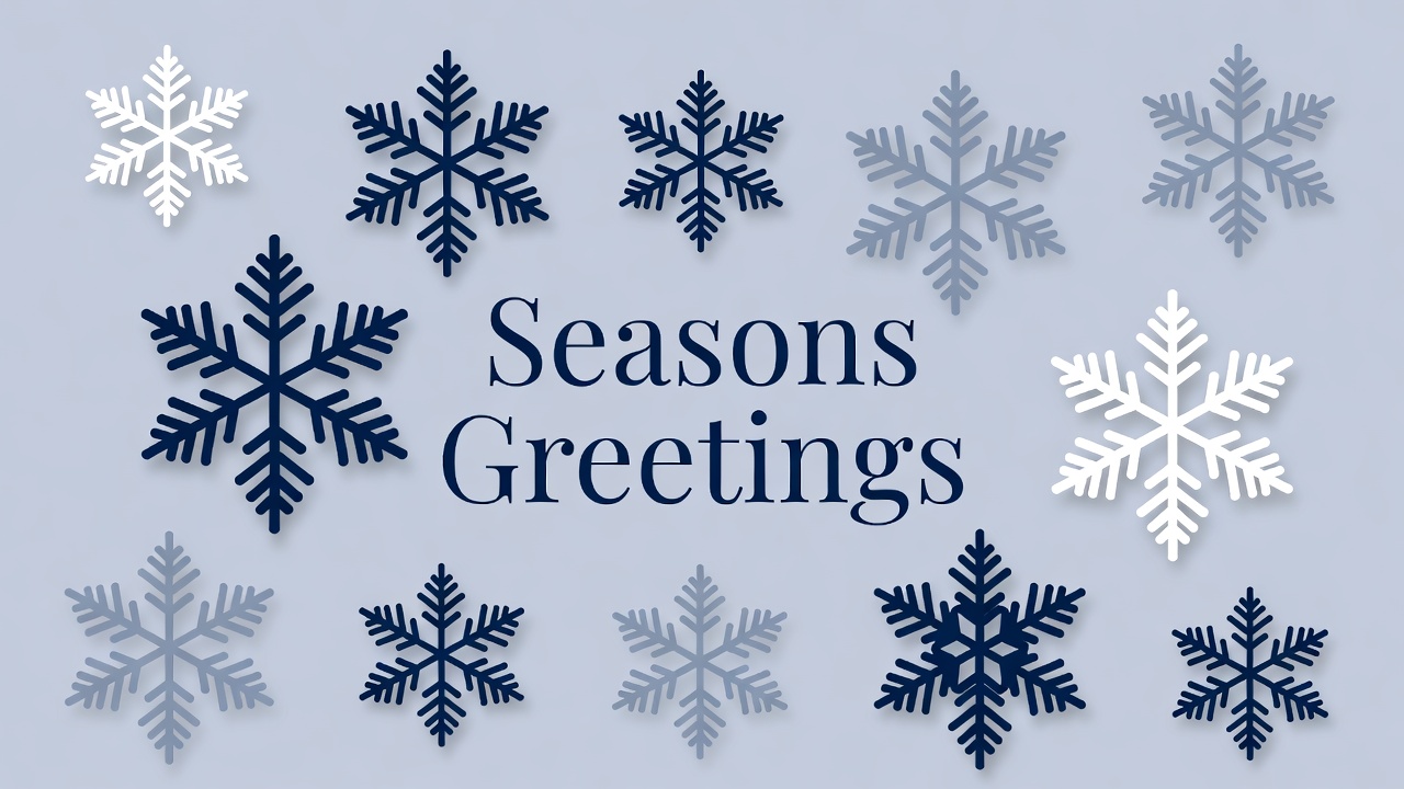 A clipart illustration features multiple snowflakes in shades of navy blue, light blue, and white arranged around the text 'Seasons Greetings'. The snowflakes have detailed, intricate designs on a light blue background. The bold, navy text is centered prominently.