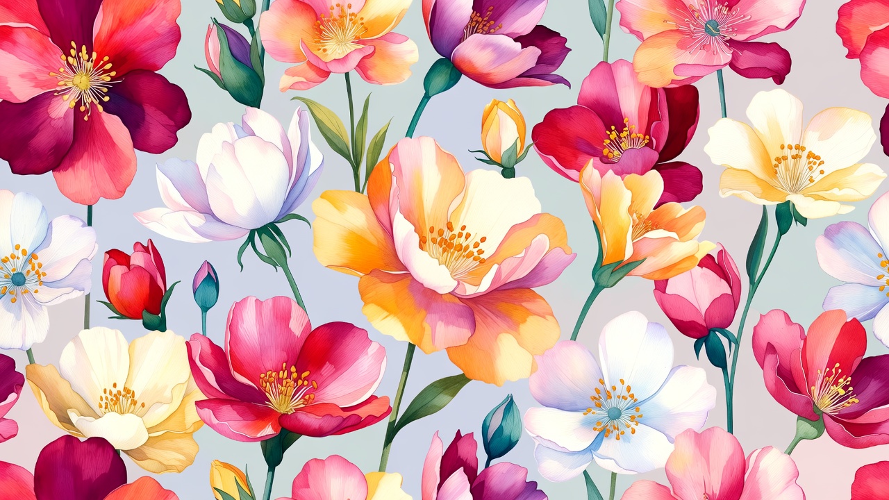 A beautiful watercolor illustration features a cluster of blooming peony flowers in vibrant shades of pink, red, orange, yellow, and white. Delicate buds and green stems add texture against a soft gray background. The flowers are arranged in a dense, natural bouquet style.