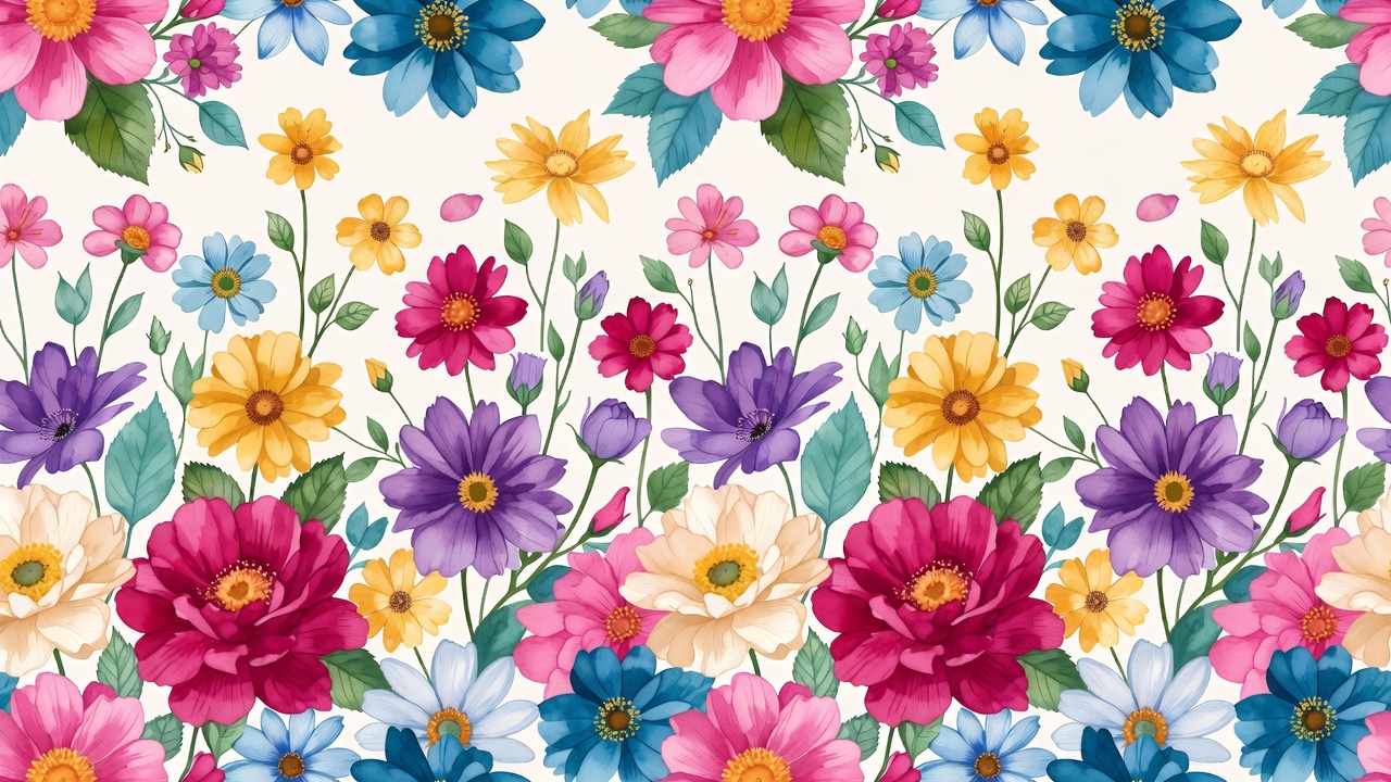 A vibrant watercolor illustration features a horizontal border of assorted flowers in pink, purple, yellow, blue, and white hues. Blooms such as roses, daisies, and asters are interspersed with green leaves on a white background. The seamless floral pattern is detailed with soft brush strokes.