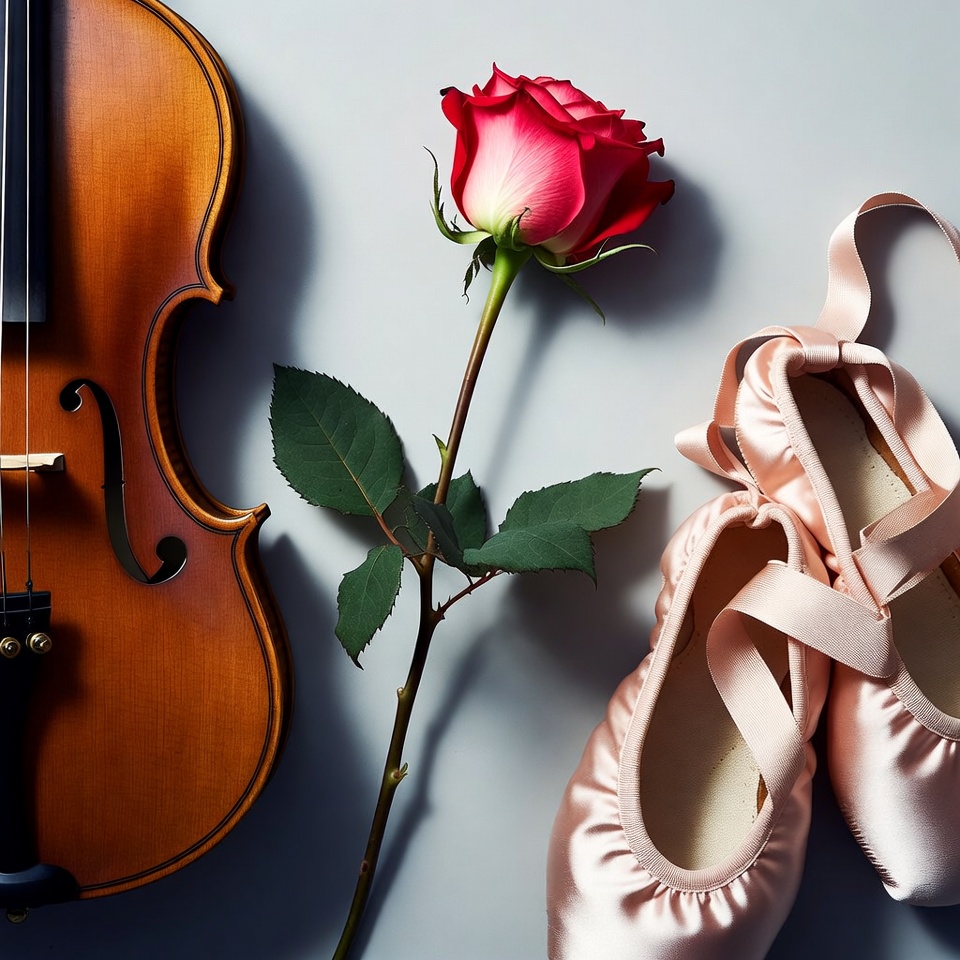 A wooden violin lies on a light blue background next to a vibrant red rose with green leaves. Pink ballet slippers with ribbons are positioned nearby. The objects are arranged in a flat lay composition.