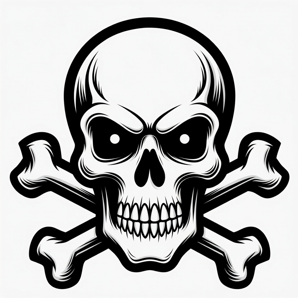 A bold black line art illustration of a human skull with crossed bones beneath it. The skull features a menacing expression with glaring eyes and grinning teeth. It is set against a white isolated background.