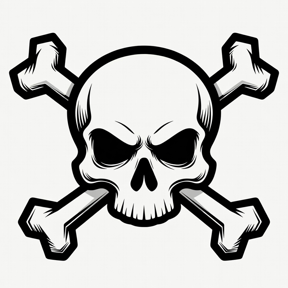 A bold black skull and crossed bones illustration on a white background. The skull features a menacing expression with deep eye sockets and detailed shading. The bones are angled sharply beneath the skull in a classic pirate symbol design.