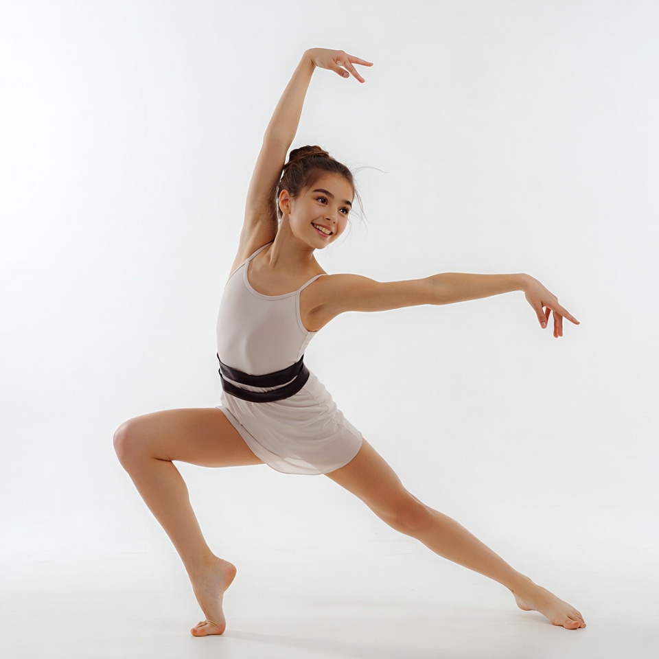 A young girl with dark hair in a bun performs a dynamic ballet pose on a white background. She wears a light pink leotard with a black belt and extends her arms gracefully while balancing on one foot. Her legs are split wide in a low lunge position with bare feet.