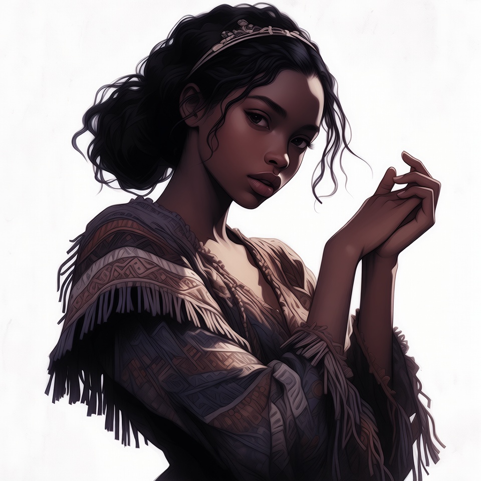 A young Black woman with curly dark hair adorned with a headpiece poses thoughtfully against a white background. She wears a fringed, multicolored poncho draped over her shoulders and gently touches her face with both hands. Her expression is serene with full lips and expressive eyes in this digital illustration style.