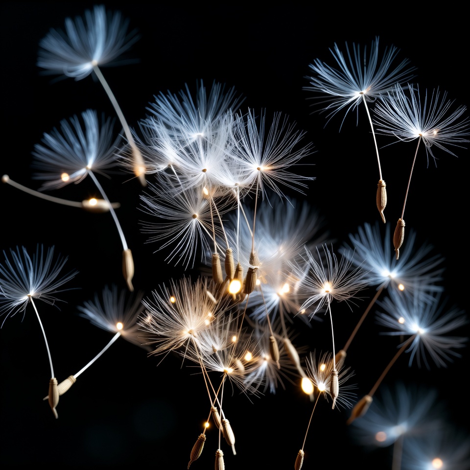 black background, dandelions, floating seeds, fluffy seeds, glowing lights, isolated background, macro photography, nature, plant seeds, seed heads, stems, white seeds, dandelion seeds