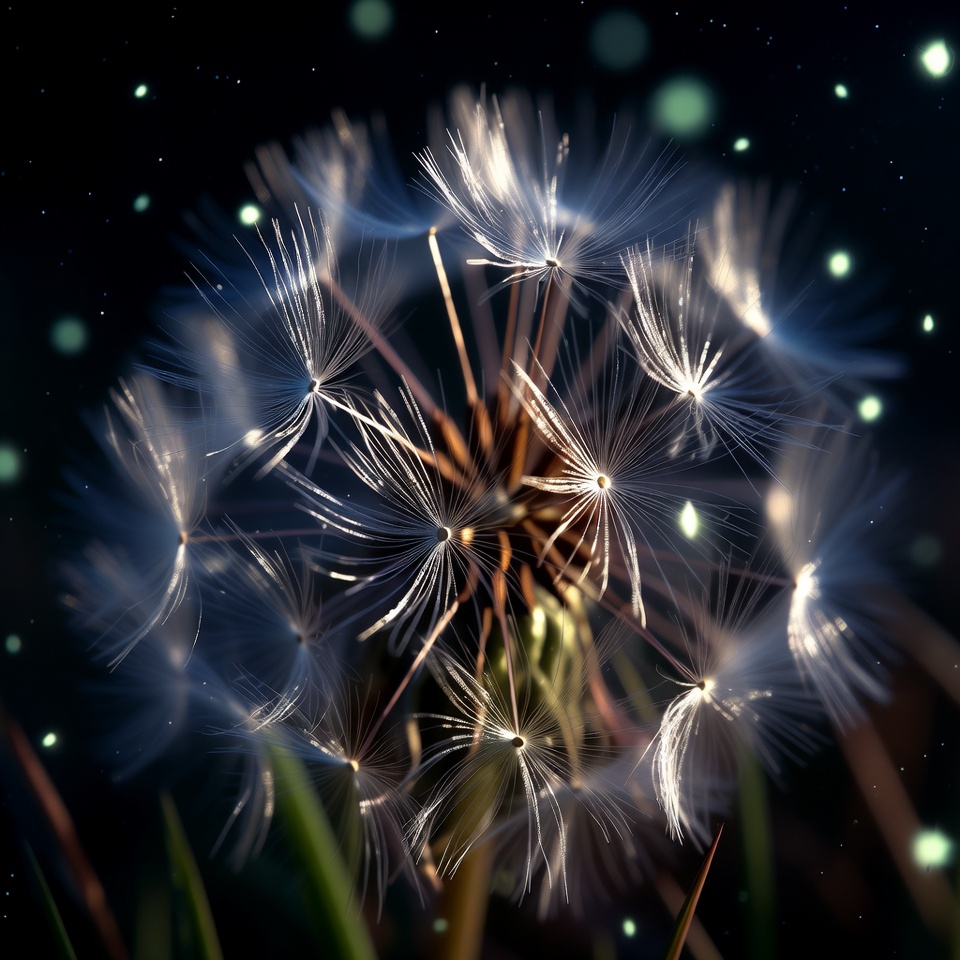 bokeh lights, dandelion seeds, dark background, fantasy flower, fluffy dandelion, glowing flower, green stems, isolated background, light effects, macro photography, nature, plant, seeds, white dandelion, dandelion