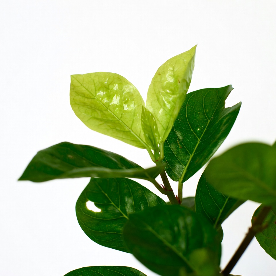 botany, closeup, dew drops, fresh foliage, glossy leaves, isolated background, leaf cluster, leaf veins, nature, plant leaves, pointed leaves, tropical plant, vibrant green, white background, green leaves