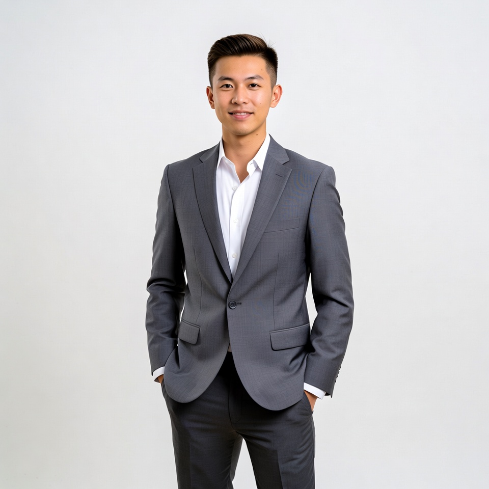 A young Asian man with short black hair stands confidently wearing a gray suit and white dress shirt. He has hands in his pockets and smiles at the camera against a plain white background. The suit features a notched lapel and slim fit.