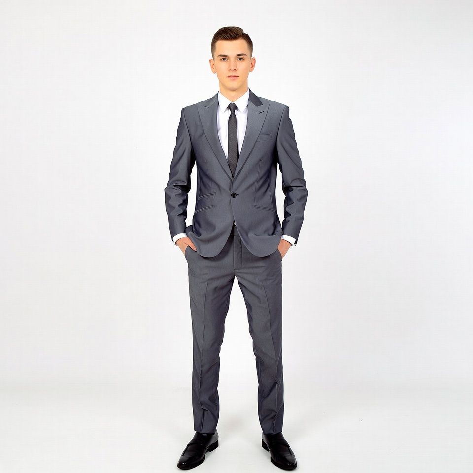 A young man with short dark hair stands confidently on a white background wearing a gray suit. He has hands in his pockets, a white dress shirt, black tie, and black dress shoes. The suit is tailored and modern.