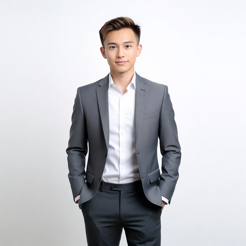 A young Asian man with short dark hair stands confidently against a white background. He wears a fitted gray suit jacket, white dress shirt, and matching gray trousers with hands in pockets. He faces the camera with a slight smile.