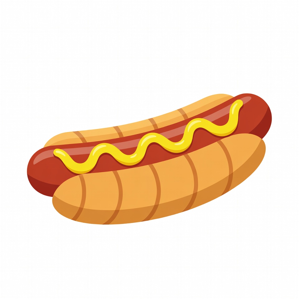 A colorful cartoon illustration of a hot dog on a bun with yellow mustard drizzled on top. The bun is orange with grill marks, and the sausage is red. It is isolated on a white background.