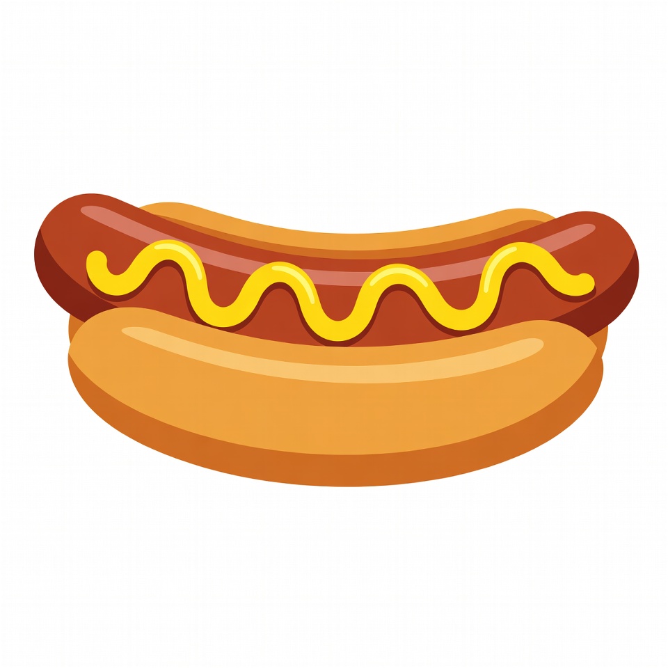 A colorful cartoon illustration of a hot dog in a bun with yellow mustard drizzled on top. The sausage is reddish-brown and the bun is golden. It is isolated on a white background.