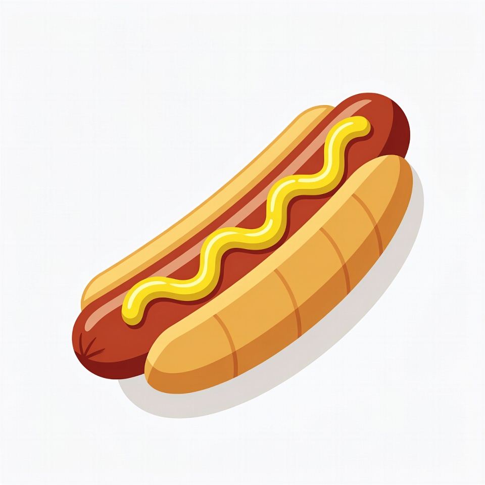 A colorful cartoon illustration of a hot dog in a bun with yellow mustard drizzled on top. The sausage is red and the bun is golden brown with textured lines. It is isolated on a white background with a subtle shadow.