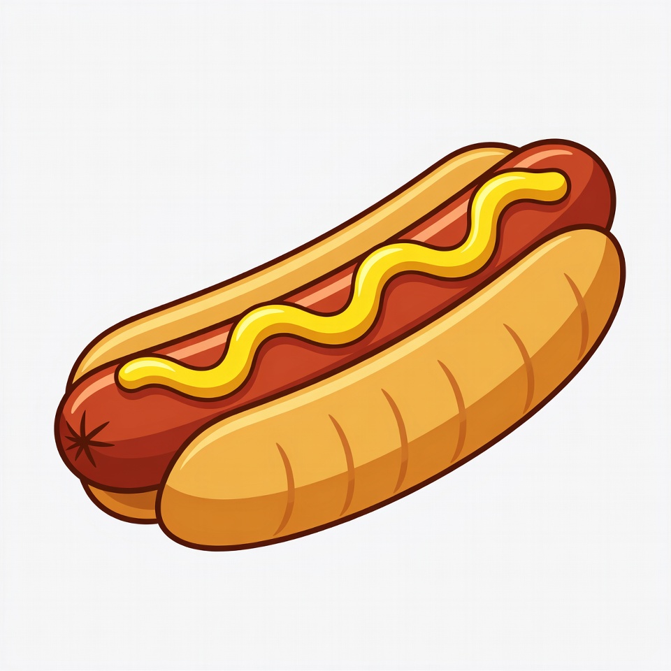A colorful cartoon illustration of a hot dog in a bun with yellow mustard zigzagged on top. The sausage is red and detailed with a star-shaped end, and the bun is golden brown. It is isolated on a white background.