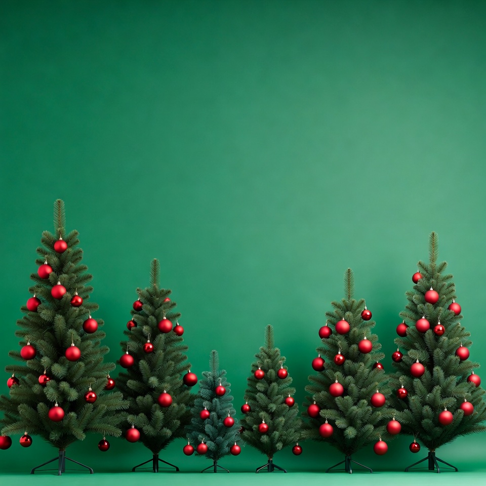 Christmas decor, Christmas display, Christmas ornaments, artificial trees, festive trees, fir trees, green backdrop, green background, holiday decoration, holiday trees, isolated background, ornamented trees, pine trees, red balls, red ornaments, row of trees, small trees, tall trees, varying heights, Christmas trees