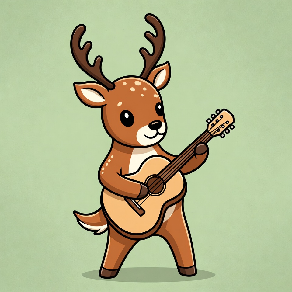 A cute cartoon deer with large antlers and spotted fur stands on a light green background, holding and playing an acoustic guitar. The deer has big expressive eyes, a smiling mouth, and a small tail. It is illustrated in a kawaii style with bold outlines and vibrant colors.