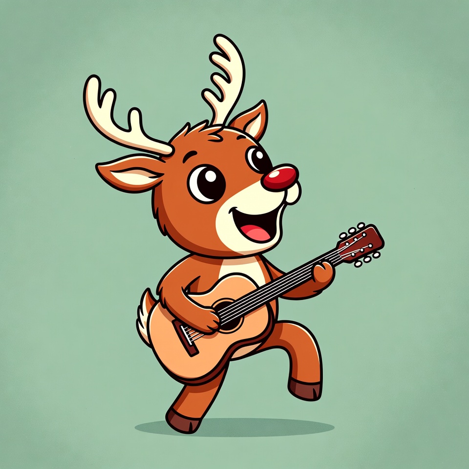 Christmas reindeer, Rudolf style, acoustic guitar, animal musician, antlers, big eyes, brown reindeer, cartoon, clipart, cute reindeer, dancing reindeer, fluffy fur, fun reindeer, guitar, happy animal, illustration, isolated background, musical reindeer, playing guitar, red nose, smiling reindeer, vector art, reindeer
