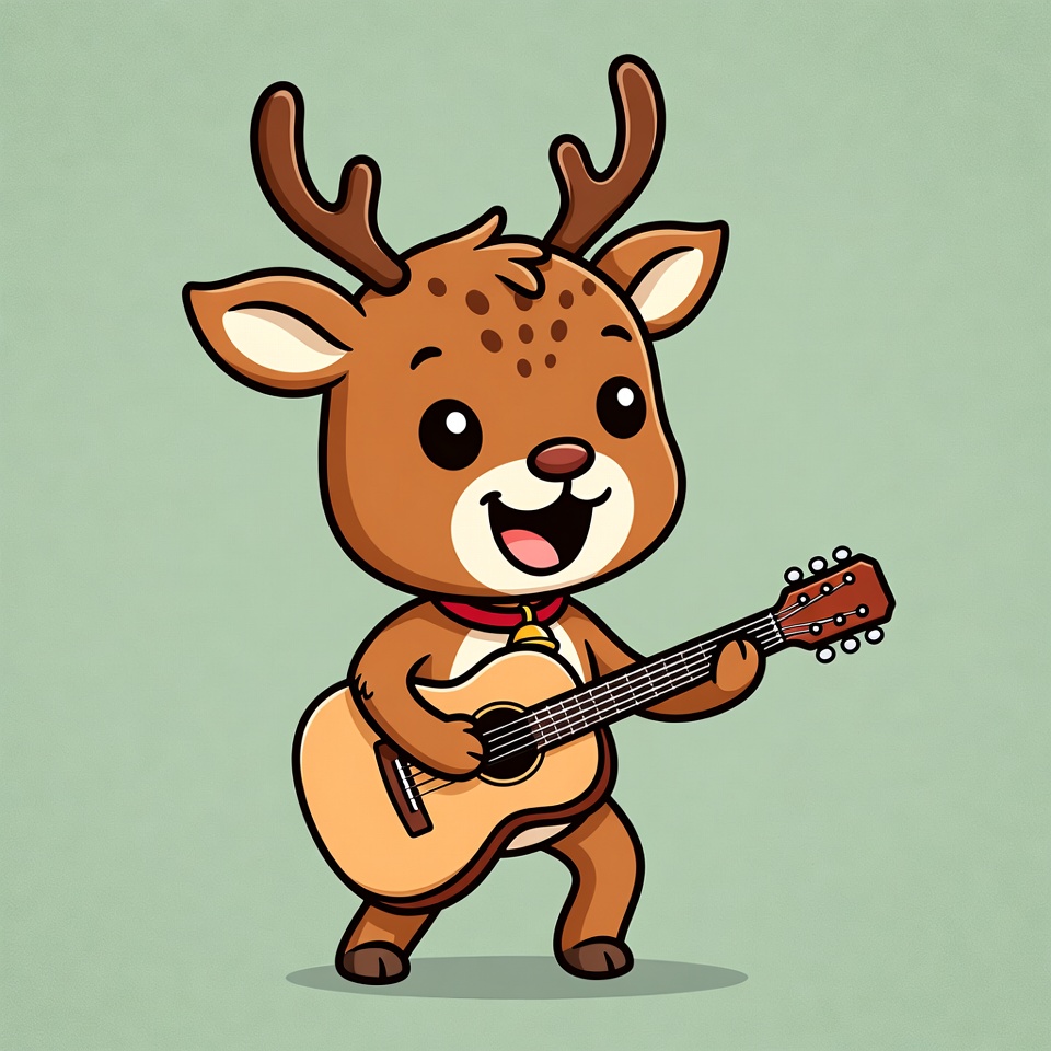 A cute cartoon reindeer with large antlers and big sparkling eyes stands on a light green background. It wears a red collar and happily plays an acoustic guitar with both hooves. The reindeer has a big smile and brown spotted fur.