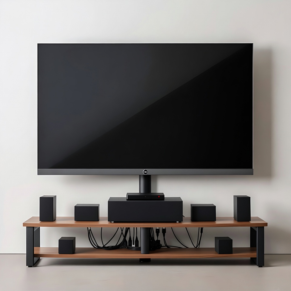 AV receiver, audio equipment, black speakers, cables, entertainment center, flat screen, home theater, media shelf, sound system, stereo speakers, television, wall mounted, white wall, wooden shelf, TV
