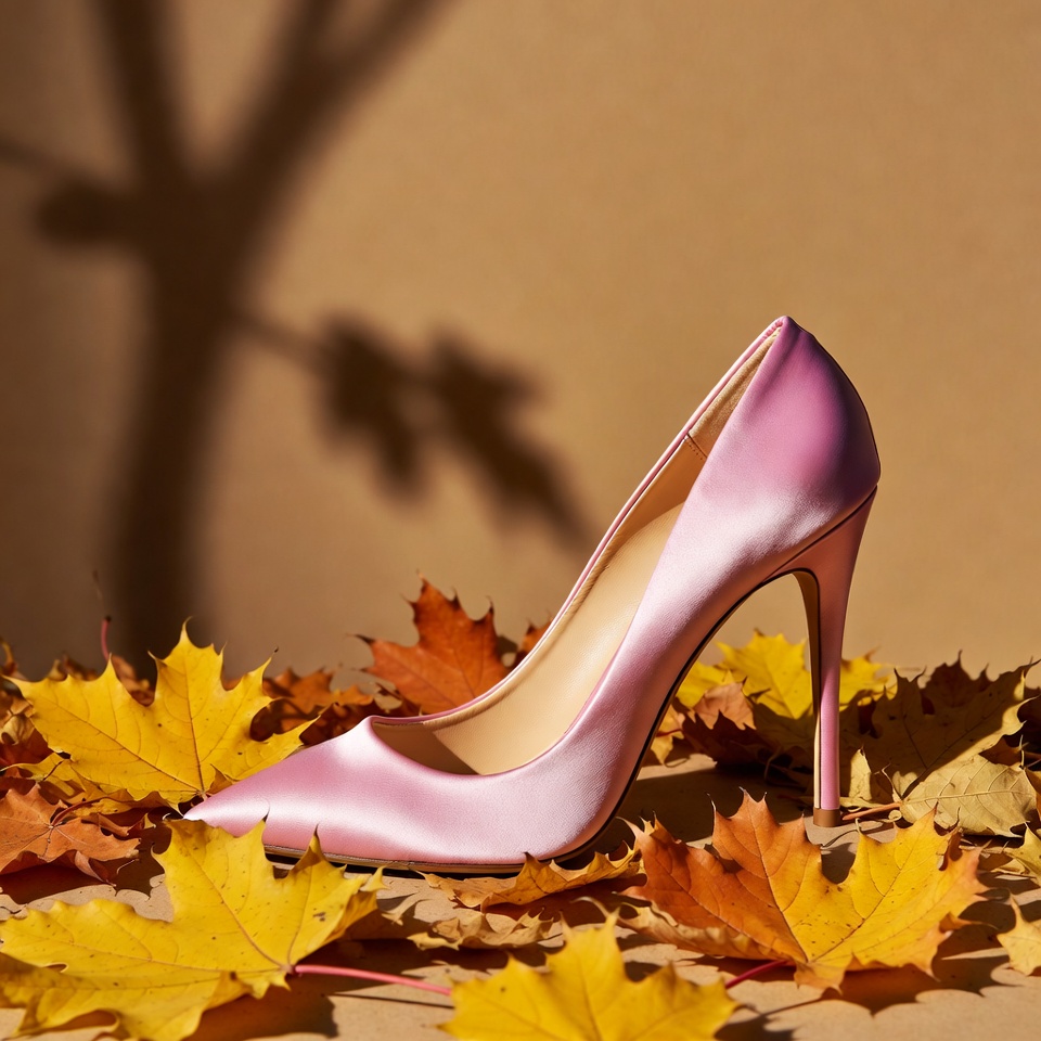 autumn leaves, branch shadow, elegant heel, fall fashion, fall leaves, fashion shoe, heel pump, high heel shoe, isolated background, leaf pile, luxury footwear, orange leaves, pink shoe, pointed toe, satin shoe, stiletto shoe, tree shadow, women's heel, yellow leaves, pink high heel