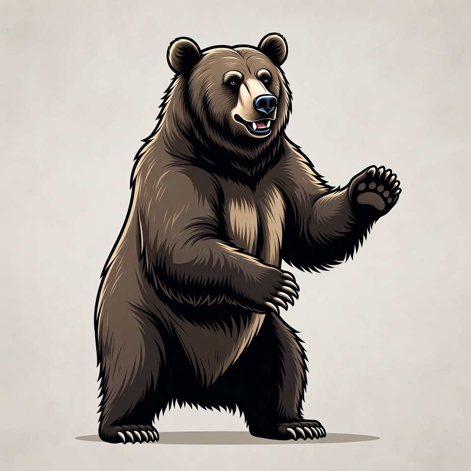 A detailed cartoon illustration of a grizzly bear standing on its hind legs with a friendly smile. The bear has thick brown fur, white markings around its eyes and muzzle, and is waving one large paw. It is depicted on a plain light gray background.