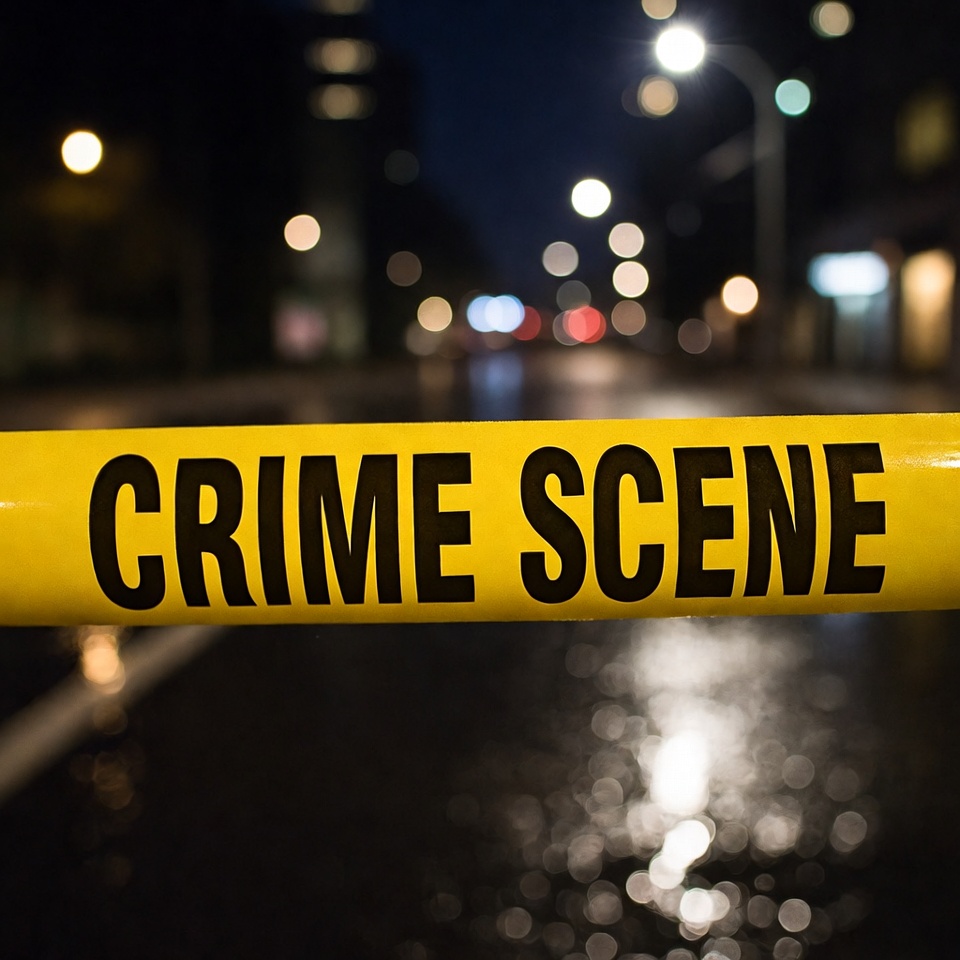Yellow crime scene tape stretches across a wet urban street at night. Bright streetlights illuminate the tape with 'CRIME SCENE' printed in bold black letters. Blurred city lights and buildings create a bokeh effect in the background.