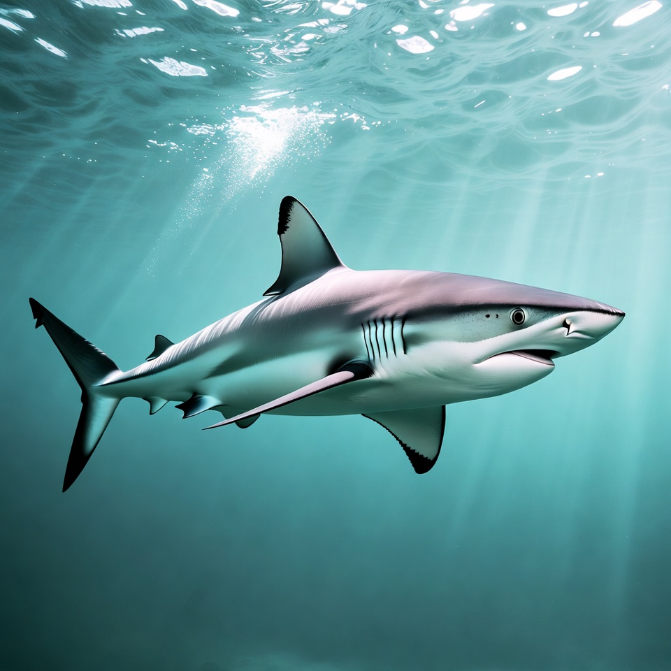 animal, aquatic, black tips, clear water, fins, fish, isolated background, marine life, ocean, predator, sea, shark, sunlight beams, swimming, turquoise water, underwater, wildlife, blacktip shark