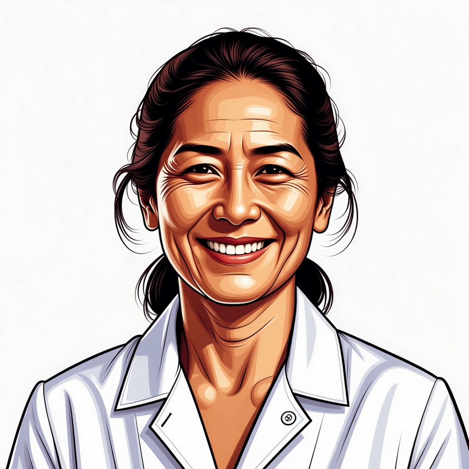 Asian, brown eyes, dark hair, digital art, female, friendly smile, happy face, headshot, illustration, isolated background, mature woman, ponytail, portrait, smiling, vector art, white coat, woman