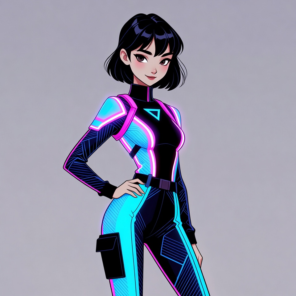 A young Asian woman with short black bob hair stands confidently in a futuristic black bodysuit accented with glowing neon blue and pink lines. She poses with one hand on her hip against a plain gray background. The illustration features detailed cyberpunk-style armor and pouches on the suit.