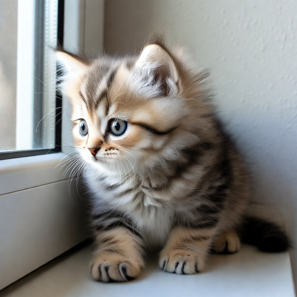 A fluffy tabby kitten with blue eyes sits on a windowsill gazing outward. Its fur features light brown, white, and black stripes, with paws extended forward. The background shows a plain white wall and window frame.
